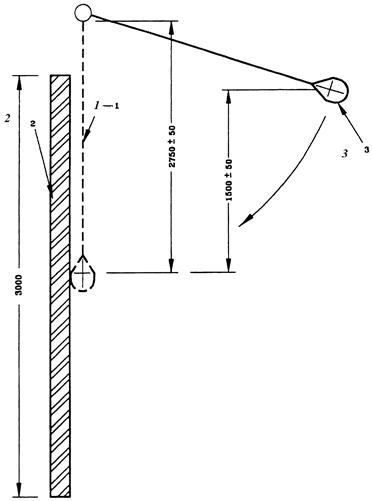 Ударное тело висит на стальном тросе, который закреплен на определенном месте испытательного прибора и расположен таким образом, что ударное тело в спокойном состоянии только касается строительной конструкции в заданной точке удара (рисунок 3). Длина маятника от точки крепления до средней точки мешка составляет (2750 50) мм. Заданная точка удара должна находиться в геометрическом центре конструкции рядом с центром ударного тела.