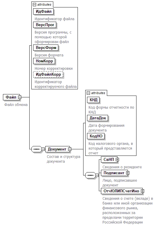 4. Логическая модель файла обмена представлена в виде диаграммы структуры файла обмена на рисунке 1 настоящего формата. Элементами логической модели файла обмена являются элементы и атрибуты XML файла. Перечень структурных элементов логической модели файла обмена и сведения о них приведены в таблицах 4.1 - 4.12 настоящего формата.