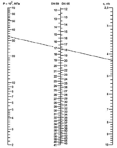 Б.2.1 Обозначить на столбце "Р" давление, до которого необходимо снизить при помощи номограммы; для получения численного значения давления, выраженного в МПа, необходимо число в столбце "P" разделить на "100". Например, на пересечении прерывистой линии со столбцом "P" давление составляет P = 34:100 = 0,34 МПа.