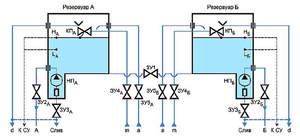 ЗУ1 - запорное устройство, соединяющее оба пожарных резервуара;