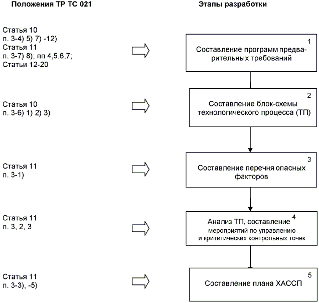 4.2 Сравнительный анализ требований главы 3 ТР ТС 021 и ГОСТ Р ИСО 22000 в сочетании с ГОСТ Р 54762-2011/ISO/TS 22002-1:2009 с другой стороны показывает, что упомянутые стандарты содержат практически все требования ТР ТС 021 и еще ряд дополнительных требований. Поэтому можно сделать вывод о том, что если предприятие внедрило ГОСТ Р ИСО 22000 (совместно с ГОСТ Р 54762-2011/ISO/TS 22002-1:2009) и может продемонстрировать соответствие его требованиям, то требования главы 3 ТР ТС 021 автоматически выполняются.