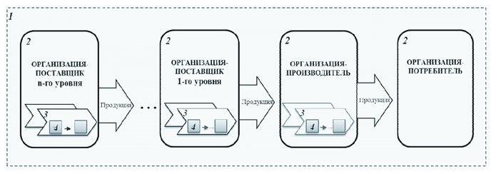 1 - межорганизационный уровень; 2 - уровень организации; 3 - уровень процессов; 4 - уровень операций