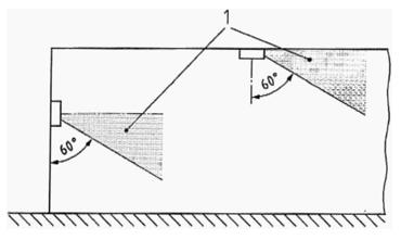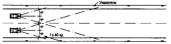 Направления, по которым ограничивается сила света световых эвакуационных указателей, лежат внутри конуса с раскрытием 2 x 15° относительно линии зрения водителя в пределах шага расстановки эвакуационных указателей. На рисунке Н.1 показаны (в плане) области ограничения силы света I указателей направления эвакуации.