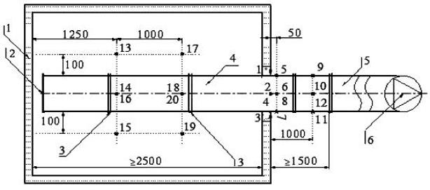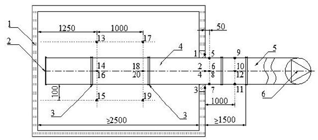 1 - печь; 2 - заглушенный торец образца; 3 - места сочленения элементов образца; 4 - испытуемый образец воздуховода (с отверстием или без него); 5 - переходной элемент; 6 - вентилятор; - ТЭП, установленные: 1 - 4 - на поверхности уплотнений воздуховода в проеме печи; 5 - 12 - на необогреваемых поверхностях воздуховода; 13 - 20 - в печи