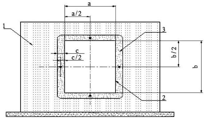 1 - печь; 2 - воздуховод; 3 - уплотнение места проходки воздуховода через ограждающую конструкцию печи; - ТЭП; a, b - внутренние размеры поперечного сечения воздуховода; c - толщина заделки