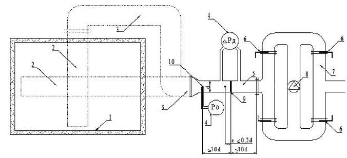 1 - печь; 2 - испытуемый образец воздуховода (установленный вертикально или горизонтально); 3 - переходной элемент; 4 - микроманометр; 5 - мерный участок; 6 - регулирующая заслонка; 7 - воздуховоды обвязки вентилятора; 8 - вентилятор; 9 - расходомерная диафрагма; 10 - точка отбора давления в полости испытуемого образца; - ТЭП
