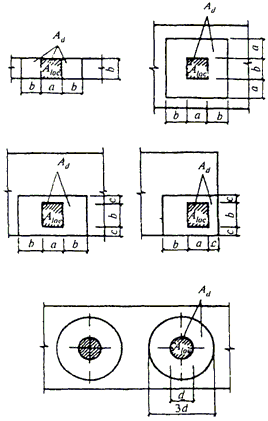 Условный фундамент следует принимать в форме прямоугольного параллелепипеда. Его размеры для свайного фундамента с заглубленным в грунт ростверком необходимо определять по рисункам 3.1 и 3.2, с расположенным над грунтом ростверком - по рисункам 3.3 и 3.4, для фундамента из опускного колодца - по рисунку 3.5.