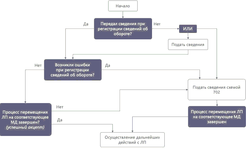 При необходимости фиксации дальнейших сведений в отношении лекарственного препарата, для которого отсутствуют успешно зарегистрированные предыдущие операции, субъект обращения лекарственных средств может осуществить оприходование такого лекарственного препарата с использованием схем 702 и 703.