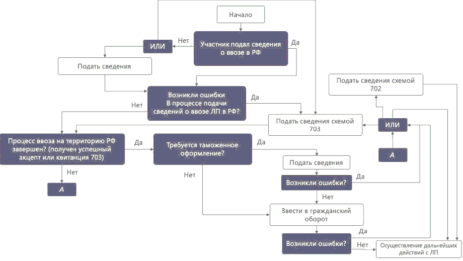 Субъект обращения, осуществивший ввоз маркированного лекарственного препарата, для последующего ввода в гражданский оборот или таможенного оформления, может осуществить оприходование такого лекарственного препарата путем загрузки схемы 703.