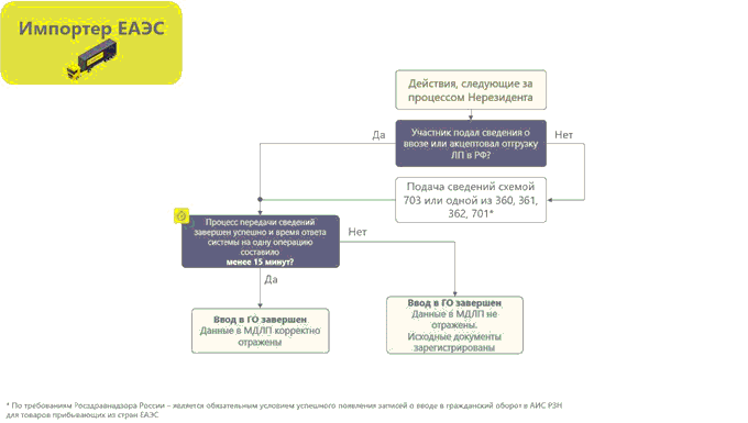 С целью осуществления корректного ввода в гражданский оборот лекарственных препаратов, ввозимых с территории ЕАЭС, необходимо обеспечить представление и успешную обработку сведений о ввозе лекарственных препаратов (либо с использованием операций 360/361/362 или воспользовавшись операцией 703).