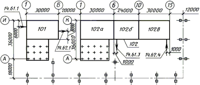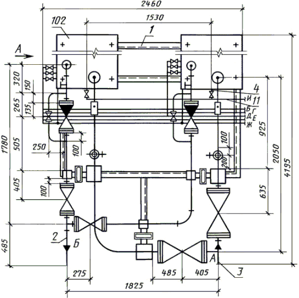 - вводы и выводы основных трубопроводов с обозначением трубопроводов и с привязкой их к координационным осям зданий (сооружений). Допускается для групповых вводов и выводов привязку выполнять только к осям крайних трубопроводов или осям подводящих эстакад.