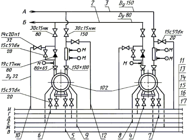 - оборудование. При трех или более одинаковых машинах или аппаратах с аналогичной обвязкой трубопроводами на схеме указывают только одну машину или аппарат с линиями и обозначением их количества и последовательности соединения;