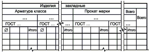 А.9 В подзаголовках граф ведомости расхода стали вместо многоточий указывают класс арматуры или марки стали проката и соответствующие стандарты или технические условия. Ниже указывают: для арматурной стали - диаметр, для профильной - условное обозначение профиля.