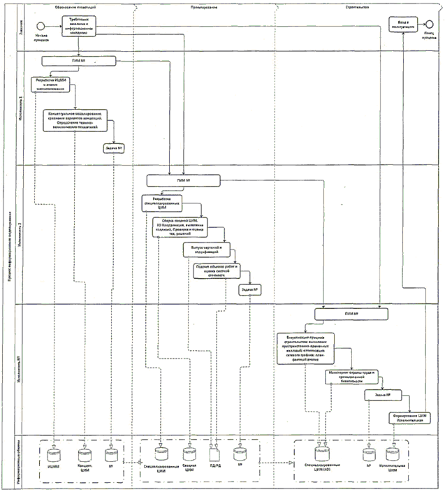 Б.1 Пример карты процесса реализации задач применения информационного моделирования на всех этапах ИСП приведен на рисунке Б.1.