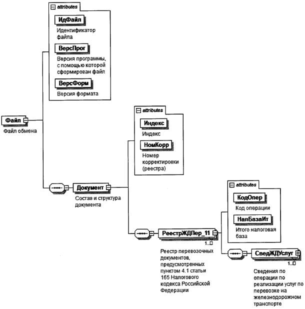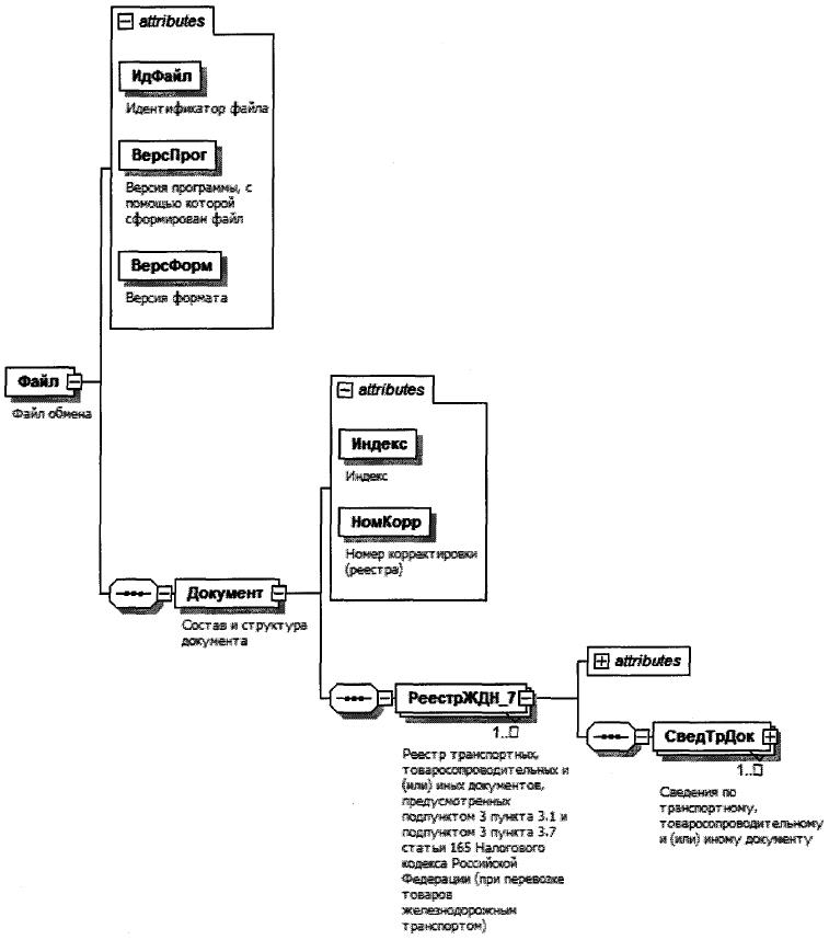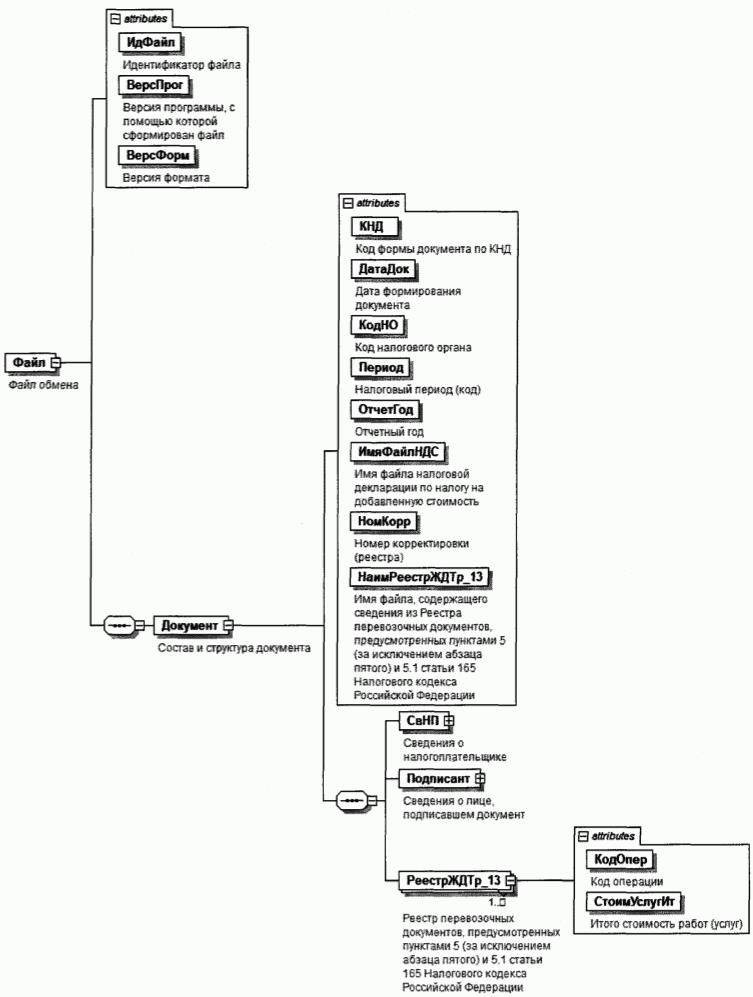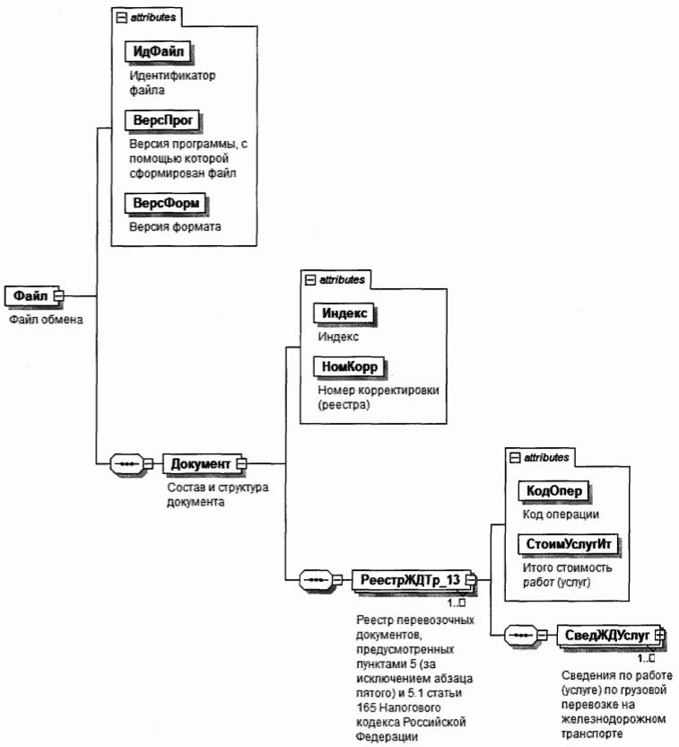 | Реестр перевозочных документов, предусмотренных пунктами 5 (за исключением абзаца пятого) 5.1 статьи 165 Налогового кодекса Российской Федерации | РеестрЖДТр_13 | С | ОМ | Состав элемента представлен в таблице 5.3 |