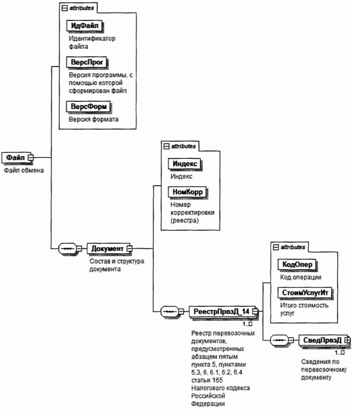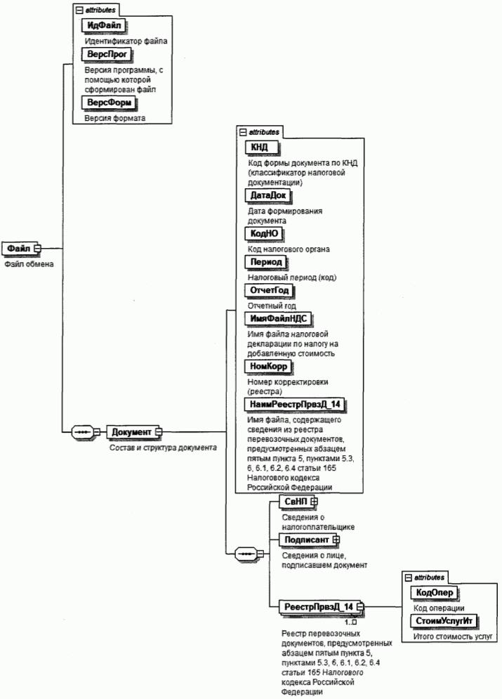 | Реестр перевозочных документов, предусмотренных абзацем пятым пункта 5, пунктами 5.3, 6, 6.1, 6.2, 6.4 статьи 165 Налогового кодекса Российской Федерации | РеестрПрвзД_14 | С | ОМ | Состав элемента представлен в таблице 5.3 |
