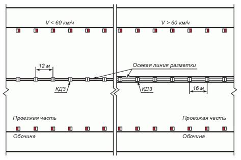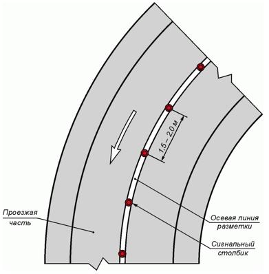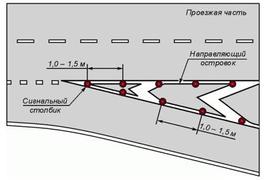 4.2.1.5 Для отклонения транспортных потоков сплошную линию разметки границы направляющего островка устраивают с отгоном 1:10 при скорости движения не более 40 км/ч, 1:20 при скорости движения свыше 40 до 60 км/ч и 1:50 - при скорости более 60 км/ч.