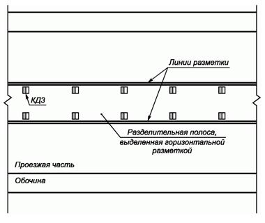 4.2.2.1 Островки безопасности устраивают для размещения пешеходов на наземных пешеходных переходах через многополосные дороги при интенсивности движения транспортных средств не менее 400 ед./ч на одну полосу проезжей части, при этом расстояние между краем проезжей части и границей островка должно быть не менее 7,5 м. Островки выделяют по 4.2.1.1.