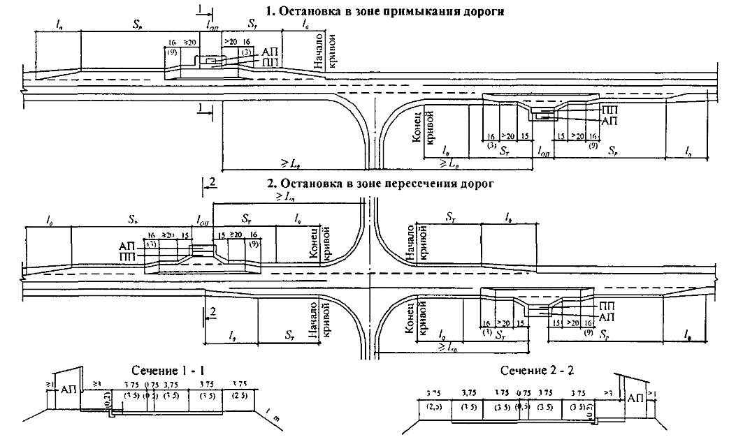 4.2.5. В зонах пересечений и примыканий дорог автобусные остановки располагают от пересечений на расстоянии не менее расстояния видимости для остановки автомобиля.