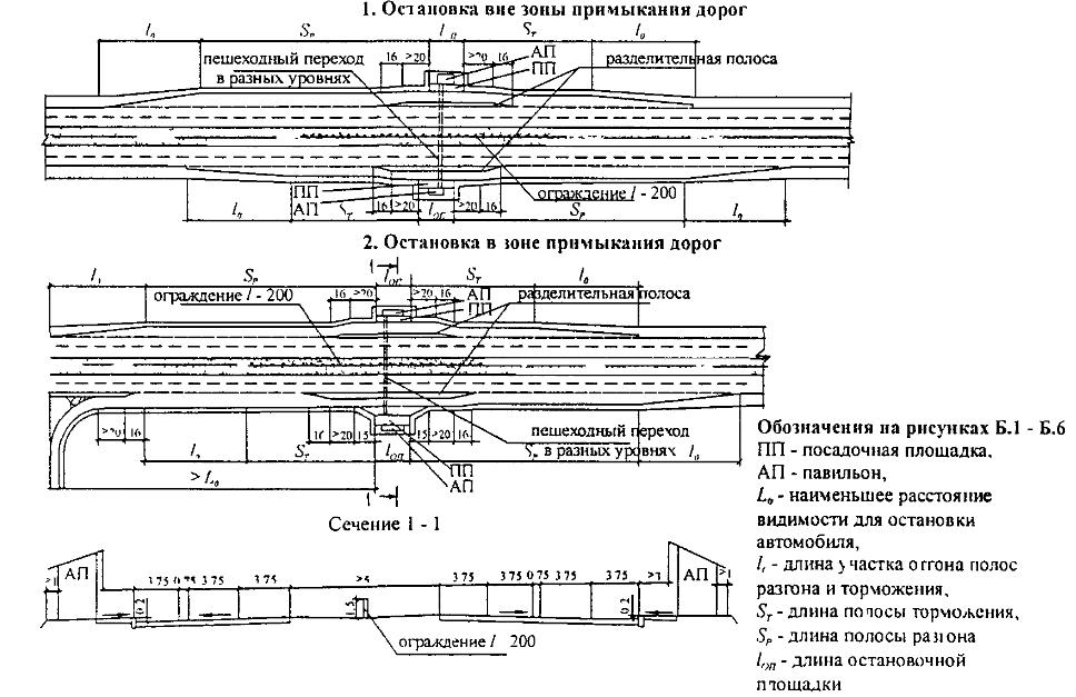 Рис. Б.1. Автобусные остановки на дорогах I-б категории с пешеходным переходом в разных уровнях