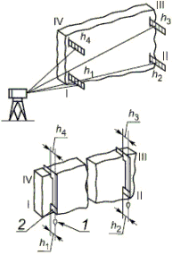 При этом соответствие реального взаимного положения поверхностей изделия (линий, осей) установленным требованиям определяют измерениями соответствующих линейных и угловых размеров и их отклонений. Положение проемов, выступов, вкладышей, закладных деталей и других характерных деталей изделий проверяют измерениями указанных в рабочих чертежах размеров между этими деталями или между деталями и гранями (линиями, точками) элемента, принятыми за начало отсчета.