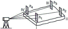 В.2.1 Условную плоскость проводят через одну из диагоналей параллельно другой диагонали, например через диагональ I - III параллельно диагонали II - IV, где I, II, III, IV - угловые точки разметки.