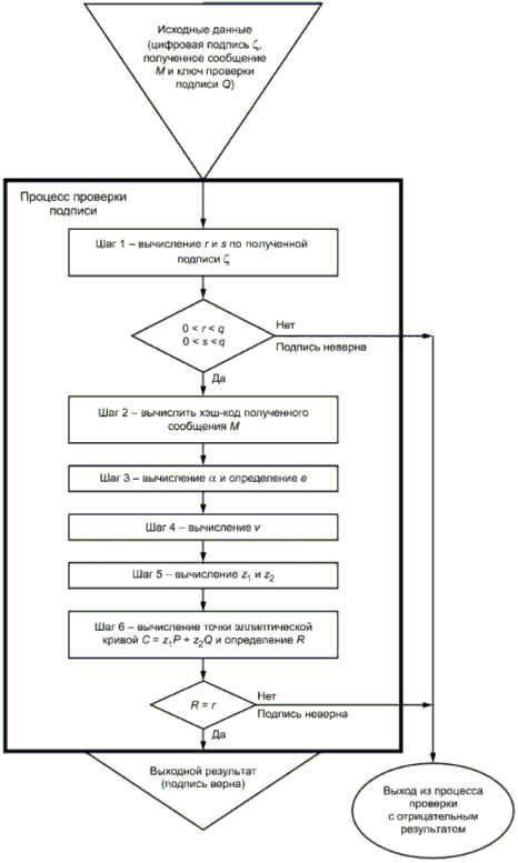 3.1.8 процесс проверки подписи (verification process): Процесс, в качестве исходных данных которого используются подписанное сообщение, ключ проверки подписи и параметры схемы ЭЦП, результатом которого является заключение о правильности или ошибочности цифровой подписи.