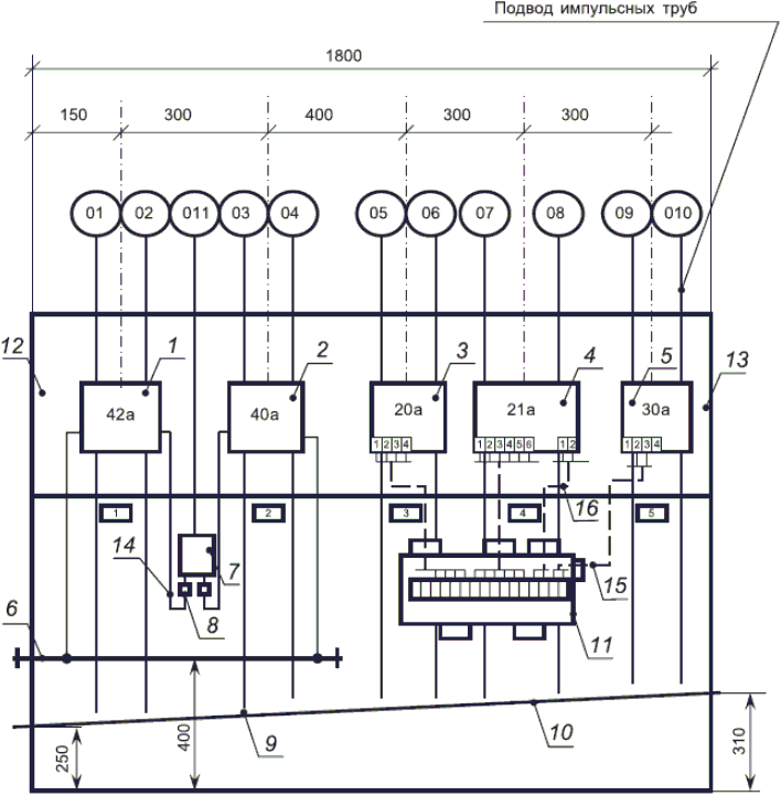 6.3.3. На виде спереди единичного щита показывают приборы, аппараты сигнализации и органы управления, элементы мнемосхем, надписи о назначении приборов.