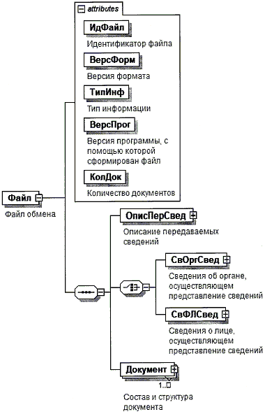 4. Логическая модель файла обмена представлена в виде диаграммы структуры файла обмена на рисунке 1 настоящего формата. Элементами логической модели файла обмена являются элементы и атрибуты XML файла. Перечень структурных элементов логической модели файла обмена и сведения о них приведены в таблицах 4.1 - 4.7 настоящего формата.