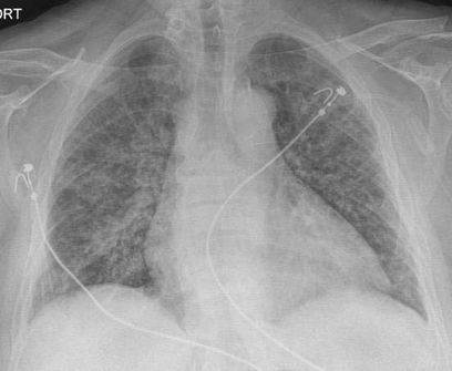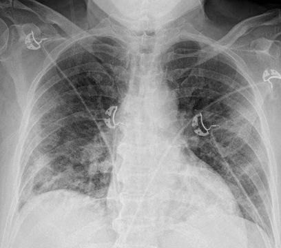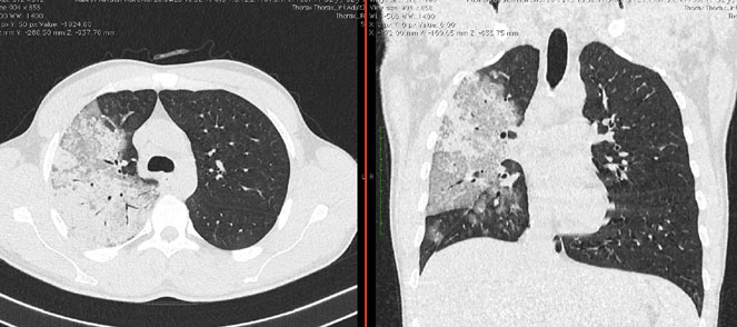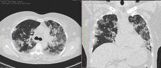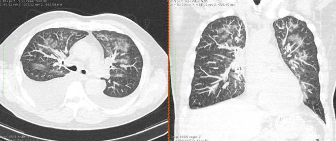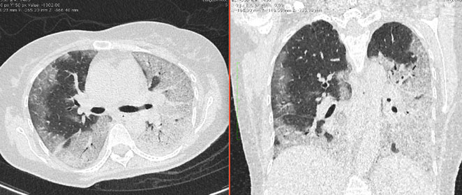 - Изменения в легких при КТ (рентгенографии), типичные для вирусного поражения (объем поражения значительный или субтотальный; КТ 3 - 4)
