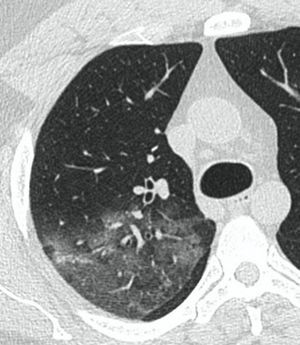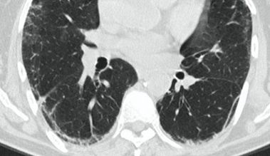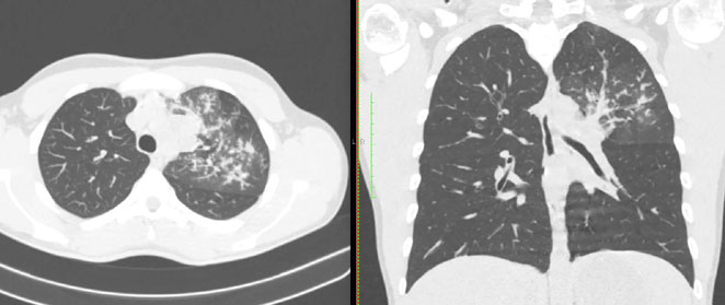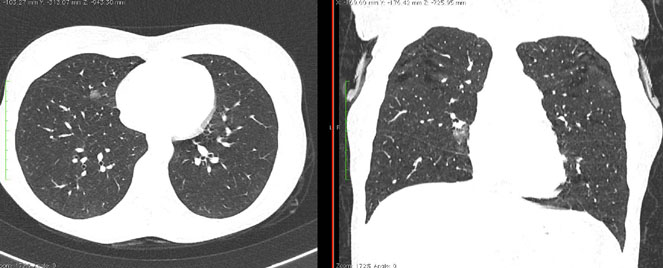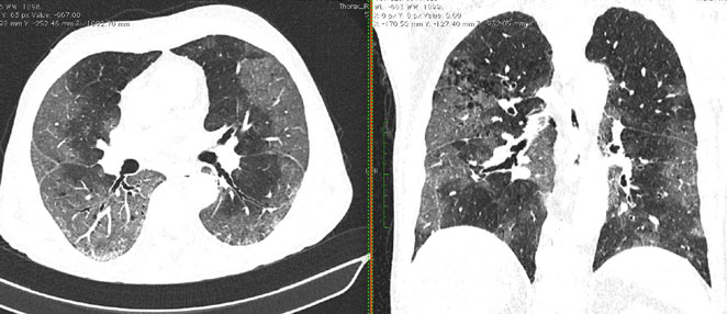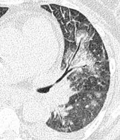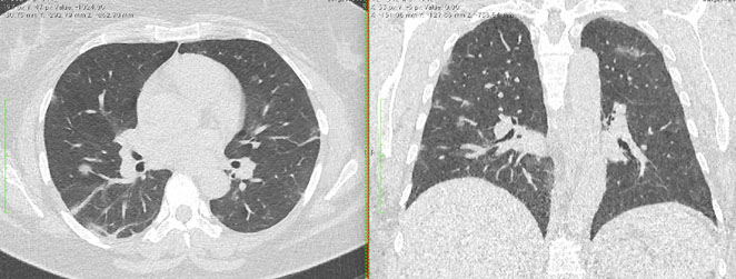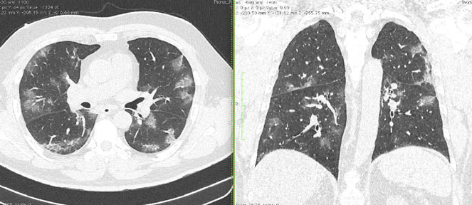 - Изменения при КТ (рентгенографии), типичные для вирусного поражения (объем поражения минимальный или средний; КТ 1 - 2)