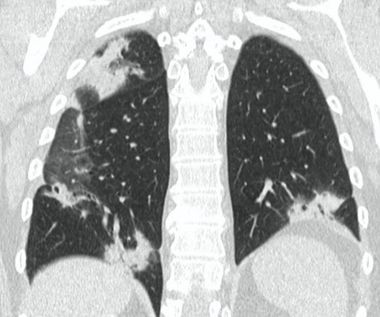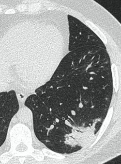 Наиболее тяжелая одышка развивается к 6 - 8-му дню от момента заболевания. Также установлено, что среди первых симптомов могут быть миалгия (11%), спутанность сознания (9%), головные боли (8%), кровохарканье (2 - 3%), диарея (3%), тошнота, рвота, сердцебиение. Данные симптомы в начале болезни могут наблюдаться и при отсутствии повышения температуры тела.