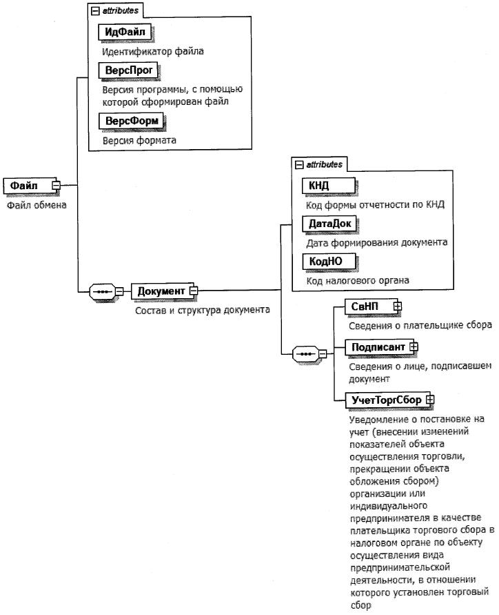 1. Настоящий формат описывает требования к XML файлам (далее - файл обмена) передачи в электронной форме сведений по уведомлению о постановке на учет (внесении изменений показателей объекта осуществления торговли, прекращении объекта обложения сбором) организации или индивидуального предпринимателя в качестве плательщика торгового сбора в налоговом органе по объекту осуществления вида предпринимательской деятельности, в отношении которого установлен торговый сбор, в налоговые органы.