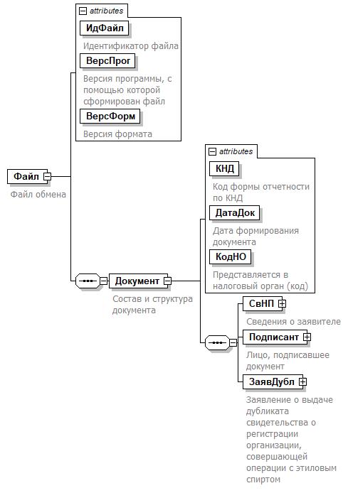 1. Настоящий формат описывает требования к XML файлам (далее - файл обмена) передачи в налоговые органы заявления о выдаче дубликата свидетельства о регистрации организации, совершающей операции с этиловым спиртом, в электронной форме.