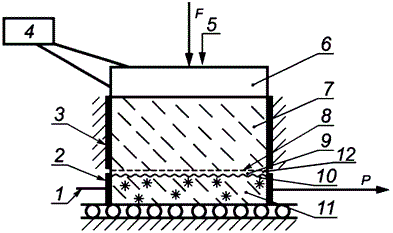 11 - мерзлый грунт; 12 - температурный датчик (щуп); F - нормальная нагрузка; P - касательная нагрузка