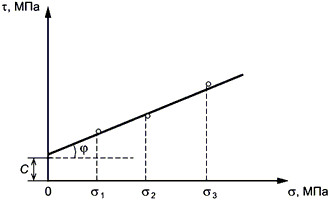 Угол внутреннего трения и удельное сцепление c, МПа, вычисляют по формулам:
