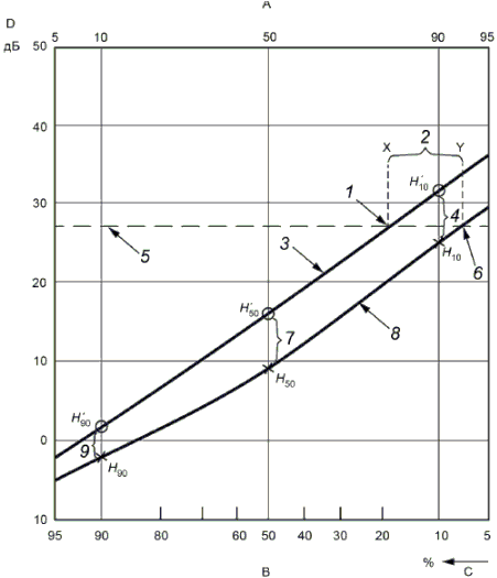A - процент людей с хорошим слухом; B - процент людей с пониженным слухом; C - вероятность потери слуха (%); D - порог слышимости (дБ); 1 - вероятность потери слуха вследствие возраста и воздействия шума, 18% (точка X); 2 - вероятность потери слуха вследствие воздействия шума, 11,5% (разность между точками X и Y); 3 - порог слышимости, связанный с возрастом, для группы людей, подвергавшейся воздействию шума; 4 - постоянное смещение порога слышимости, обусловленное шумом (10%); 5 - предполагаемый граничный порог слышимости, 27 дБ; 6 - вероятность потери слуха группы людей; 7 - постоянное смещение порога слышимости, обусловленное шумом (50%); 8 - порог слышимости, связанный с возрастом, для группы людей не подвергавшейся воздействию шума; 9 - постоянное смещение порога слышимости, обусловленное шумом (90%)