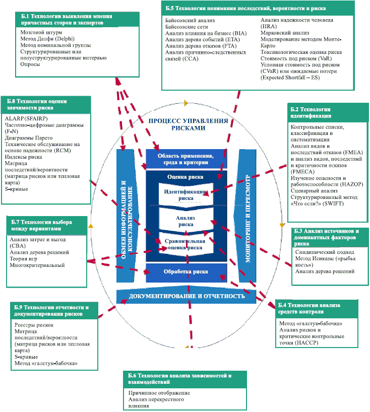 ГОСТ Р ИСО 31000 описывает принципы управления рисками, основы и организационные механизмы, которые позволяют управлять рисками. В нем определен процесс, в рамках которого существует возможность распознавать, понимать и изменять риск в соответствии с критериями, которые устанавливаются в рамках этого же процесса. Технологии оценки риска могут применяться в рамках данного структурированного подхода для определения области применения, среды и критериев, оценки риска, обработки риска, мониторинга и пересмотра, документирования и отчетности, обмена информацией и консультирования. Этот процесс проиллюстрирован на рисунке 1, где также приведены примеры того, где, в рамках процесса, данные техники могут быть применены. В ГОСТ Р ИСО 31000 оценка рисков включает в себя идентификацию рисков, их анализ и использование информации, полученной в результате анализа, для сравнительной оценки риска и формирования выводов относительно их значимости по отношению к целям и показателям эффективности деятельности организации. Этот процесс вносит вклад в принятие решений о том, требуется ли обработка риска, каковы приоритеты обработки и какие мероприятия, направленные на снижение риска, необходимо предпринять. На практике данный подход носит итеративный характер.