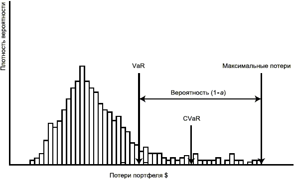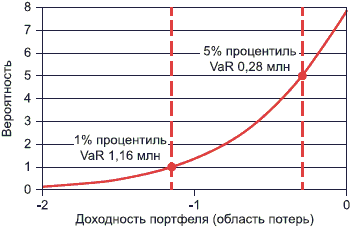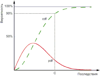 В pdf отображается вероятность различных значений последствий в визуальной форме, включая наиболее вероятное значение, дисперсию и вероятность возникновения экстремального события.