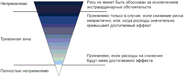 Это будет зависеть от подходов к определению шкал и отношения организации к риску. Структура матрицы должна позволить определять приоритетность риска исходя из того, в какой степени он приводит к результатам, которые находятся за пределами установленных организацией порогов производительности относительно ее целей.