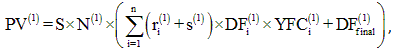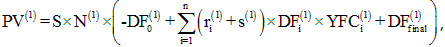4.8.2. Если условия своп-договора (контракта) предусматривают уплату денежных сумм, рассчитанных на основании номинальной суммы, выраженной в первой валюте, и фиксированной ставки процента (в долях единицы) в первой валюте, дисконтированная стоимость платежей по первой валюте рассчитывается по следующей формуле: