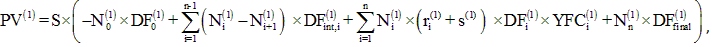 4.10.2. Если условия своп-договора (контракта) предусматривают уплату денежных сумм, рассчитанных исходя из номинальной суммы, выраженной в первой валюте, и фиксированной ставки процента (в долях единицы) в первой валюте, дисконтированная стоимость платежей, осуществляемых в первой валюте, рассчитывается по следующей формуле: