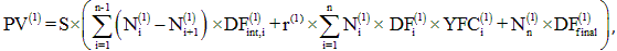4.8.3. Если условия своп-договора (контракта) предполагают уплату сумм, рассчитанных на основании номинальной суммы, выраженной в первой валюте, плавающей процентной ставки и фиксированного спреда (в долях единицы) в первой валюте, дисконтированная стоимость платежей по первой валюте рассчитывается по следующей формуле: