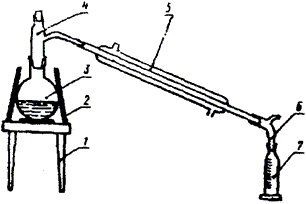 В круглодонную колбу вместимостью 150 - 200 куб. см вносят 50 куб. см модельного раствора, находившегося в контакте с изделиями из сополимера стирола с метилметакрилатом или из сополимера с метилметакрилатом и акрилонитрилом, надевают насадку Вюрца и присоединяют к прямому холодильнику. Затем отгоняют 9 куб. см дистиллята в мерный цилиндр, содержащий 1 куб. см дистиллированной воды. При этом на конец холодильника надевают аллонж, доходящий до конца мерного цилиндра.