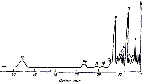 1 - бензол; 2 - толуол; 3 - этилбензол; 4 - n-ксилол; 5 - м-ксилол; 6 - изопропилбензол; 7 - о-ксилол; 8 - н-пропилбензол, n-метилэтилбензол, м-этилтолуол; 9 - стирол; 10 - фенилацетилен; 11 - метилстирол; 12 - бензальдегид; ,