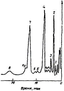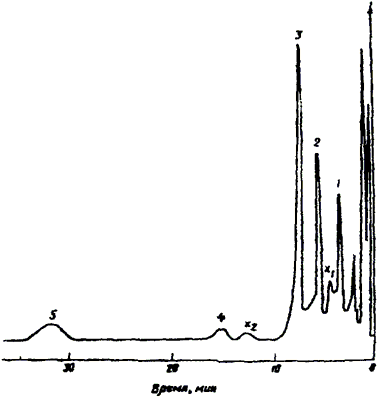 Черт. 4. Типовая хроматограмма разделения остаточных мономеров и примесей в водных вытяжках из сополимеров стирола с акрилонитрилом и метилметакрилатом