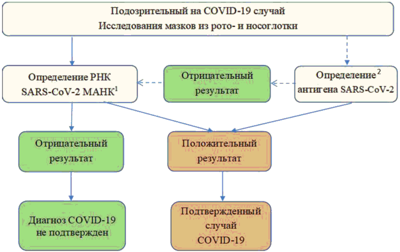 1. Положительный результат лабораторного исследования на наличие РНК SARS-CoV-2 с применением методов амплификации нуклеиновых кислот (МАНК) или антигена SARS-CoV-2 с применением иммунохроматографического анализа вне зависимости от клинических проявлений.