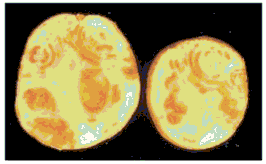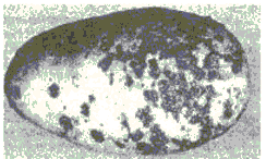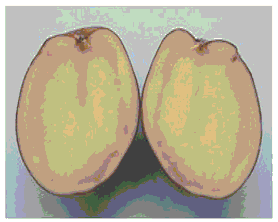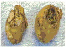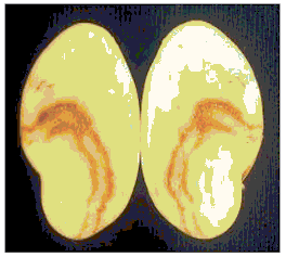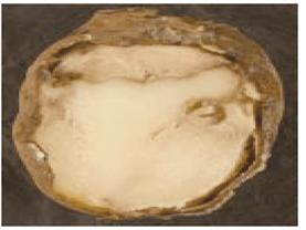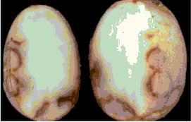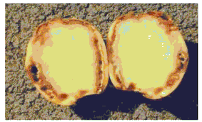 На клубнях коричневато-белая гниль обычно распространяется от нижней части клубня или от глазков. Пораженный участок ограничен темным краем. Чувствуется отчетливый рыбный запах (рисунок Д.4.3, рисунок Д.4.4).