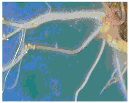 Картофель поражается двумя разновидностями Globodera: G. rostochiensis и G. pallida. В культуре на корню заражение проявляется в наличии очагов ослабленных или чахлых растений с тенденцией к увяданию или растений с потемневшей или обесцвеченной листвой (рисунок Д.1.5). На корнях можно различить (невооруженным глазом или с помощью ручной лупы) белые или золотисто-желтые кисты размером менее булавочной головки (рисунок Д.1.6).
