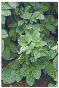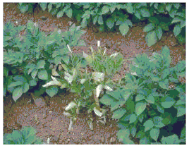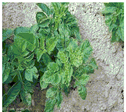 На растениях симптомы проявляются на следующий год после заражения и могут варьировать в зависимости от сорта картофеля. Наиболее острым проявлением является укорачивание междоузлий верхней части стебля, что приводит к образованию низкорослой метельчатой "щетковидной" верхушки (рисунок Д.3.1). Менее острым симптомом являются желтые шевроны или пятна на листьях, которые практически не влияют на рост растения (рисунок Д.3.2). Как правило, симптомы проявляются только на 1 - 2 стеблях.